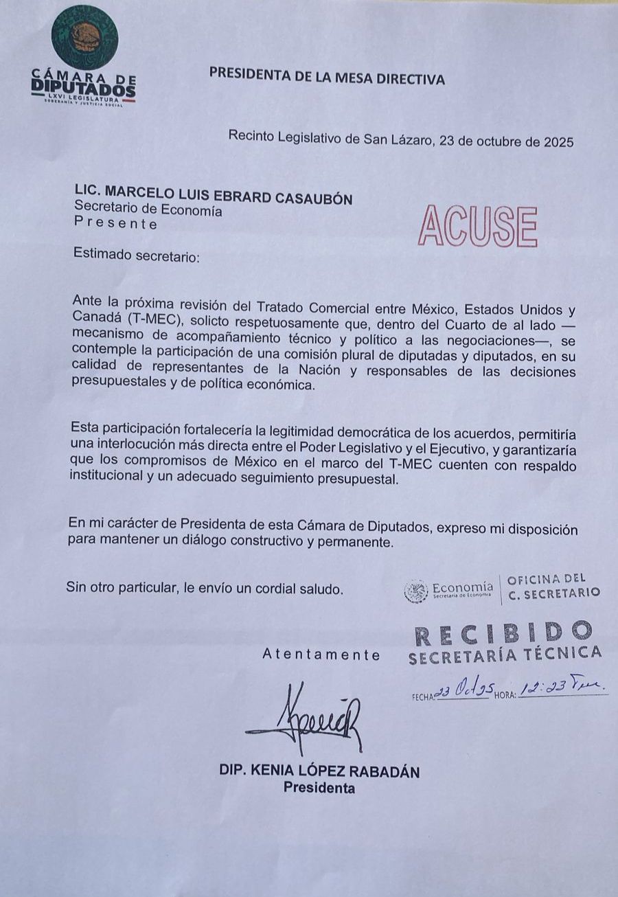 En el marco de la revisión del Tratado de libre comercio entre México, Estados Unidos y Canadá (T- MEC) la presidenta de la Mesa Directiva de la Cámara de Diputados, Kenia López Rabadán, solicitó al secretario de Economía, Marcelo Ebrard Casaubon, contemplar la participación de una comisión plural de diputadas y diputados en el Cuarto de al lado.