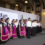 Como parte de la Ceremonia Oficial de Bienvenida en el Patio de Honor de Palacio Nacional se entonaron los himnos nacionales de México y Francia. Enseguida, la Presidenta de México y su homólogo de la República Francesa se tomaron la fotografía oficial.