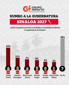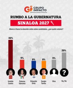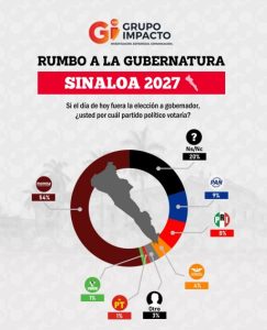 Si hoy fueran las elecciones, ¿por quién votarían los sinaloenses? Grupo Impacto refiere que por el partido guinda, instituto que obtuvo el 54 por ciento. En tanto que el PAN se hizo del 9 por ciento y el PRI del 8 por ciento.