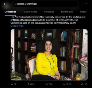 “El Comité Noruego del Nobel está profundamente preocupado por la brutal detención de Narges Mohammadi junto con otros activistas”.