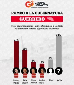 De los probables candidatos y candidatas que pudiera tener Morena, Beatriz Mojica obtuvo el mayor número de preferencias con el 27 por ciento; en tanto, Félix Salgado queda 8 puntos por debajo.
