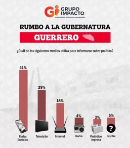 Finalmente, Grupo Impacto preguntó a los guerrerenses cuál es el medio de comunicación por el cual se informan sobre política, siendo las redes sociales el principal con el 41 por ciento.